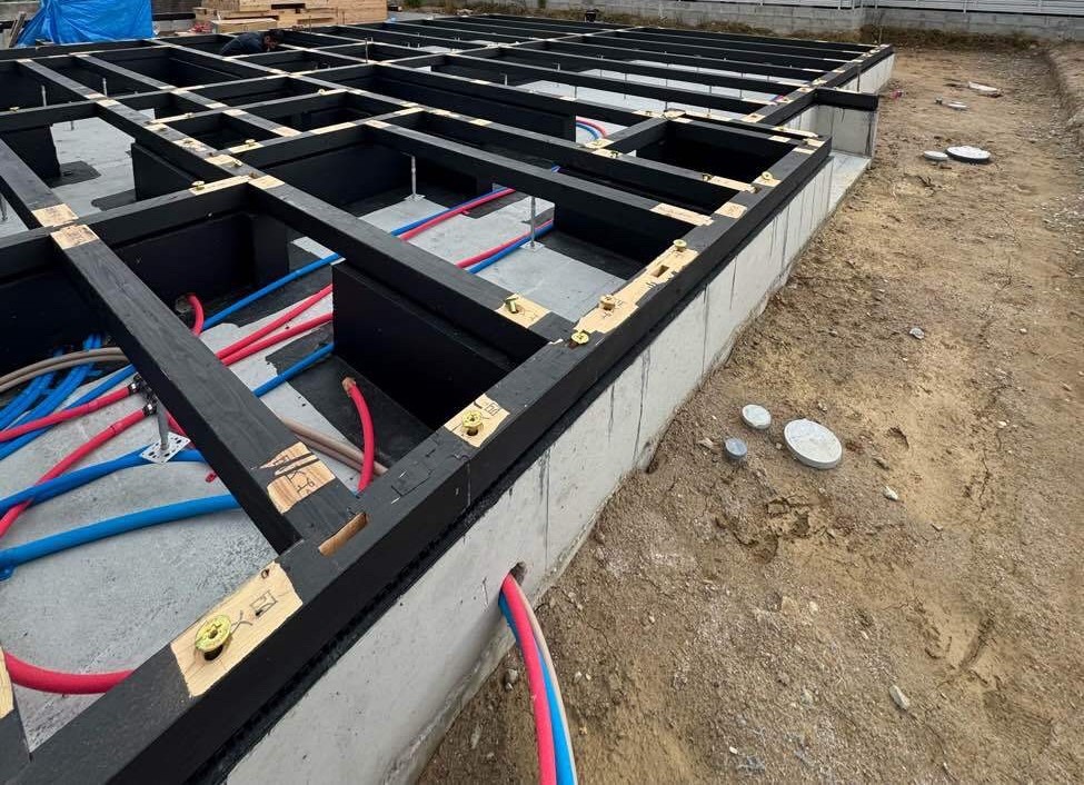 さて、I様邸ですが基礎が出来上がり、シロアリ対策をした柱と床が貼られておりました。
