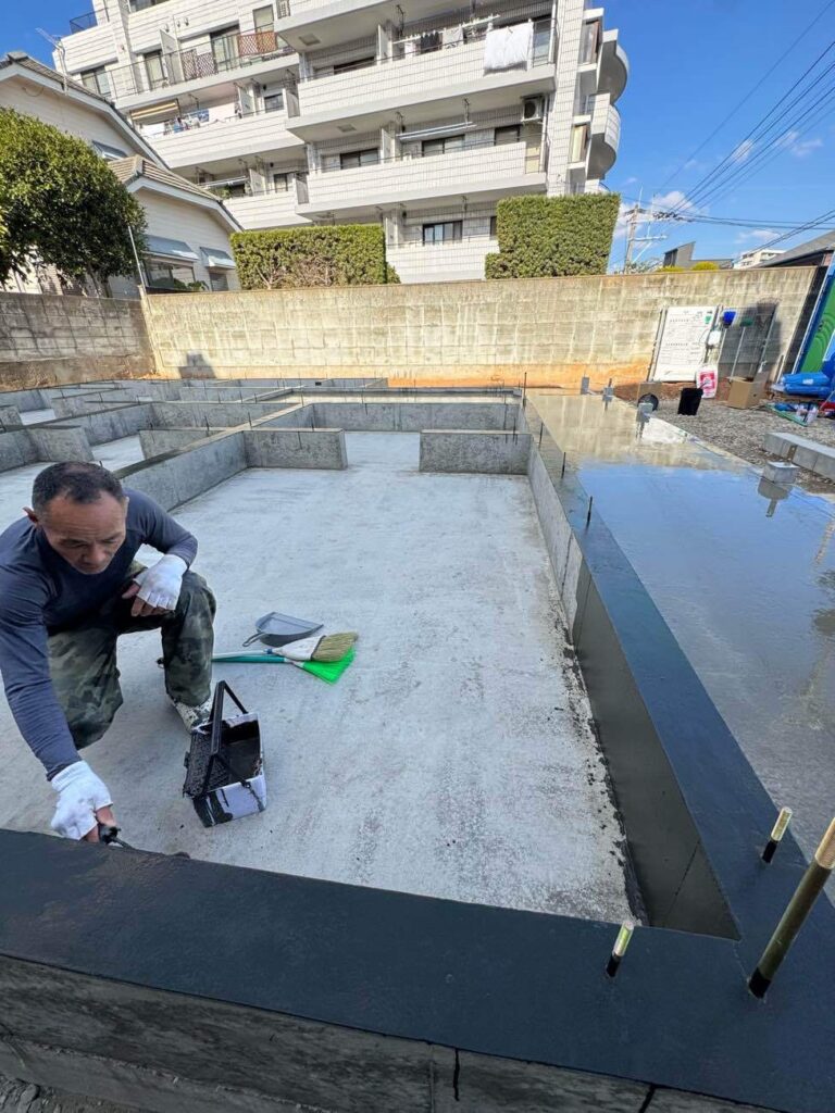棟梁が、基礎のシロアリ対策からコンクリートに塗布していきます。