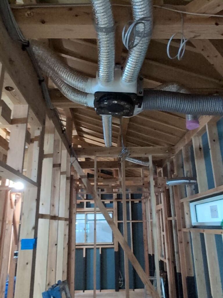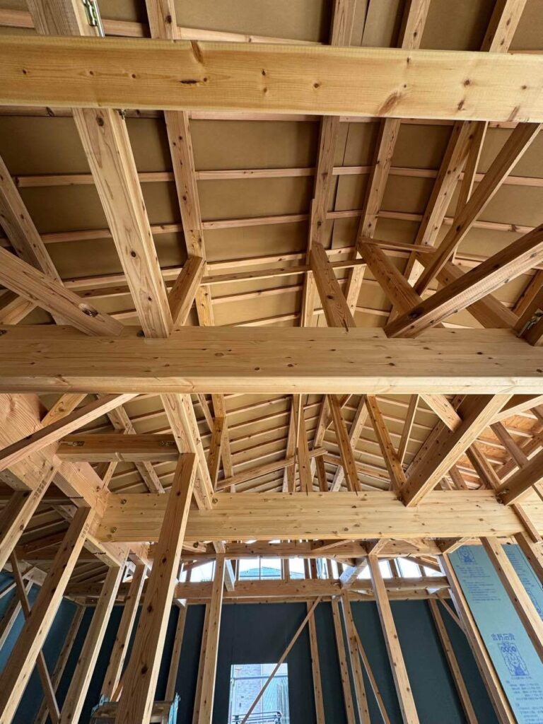 さて、Y様邸の平屋。まだ、これから内装なのですが天井がカッコイイことになっておりました。