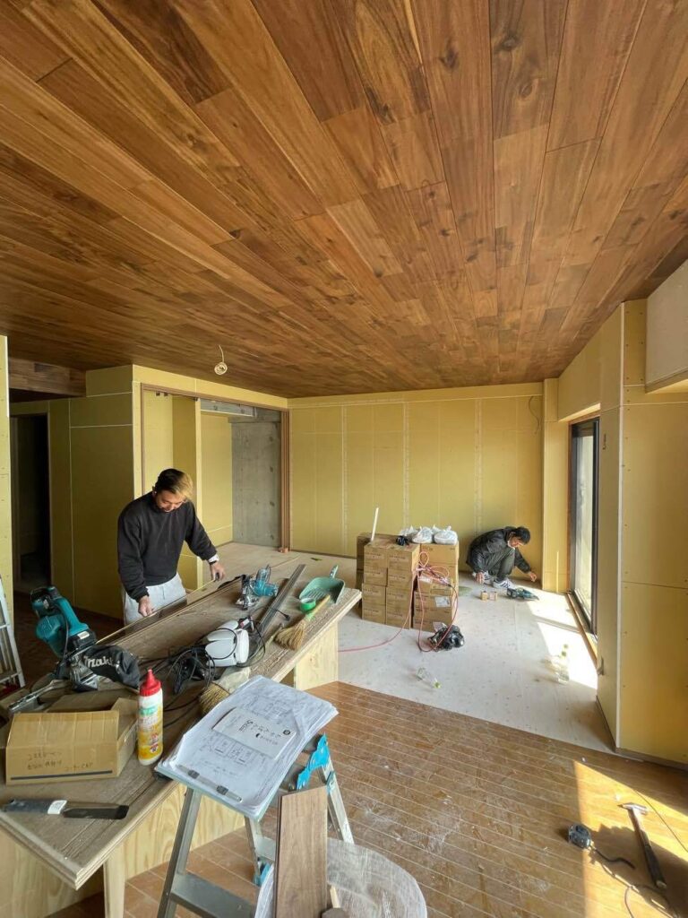 天井にウォールナットの無垢板が入り、カッコよくきまっています。