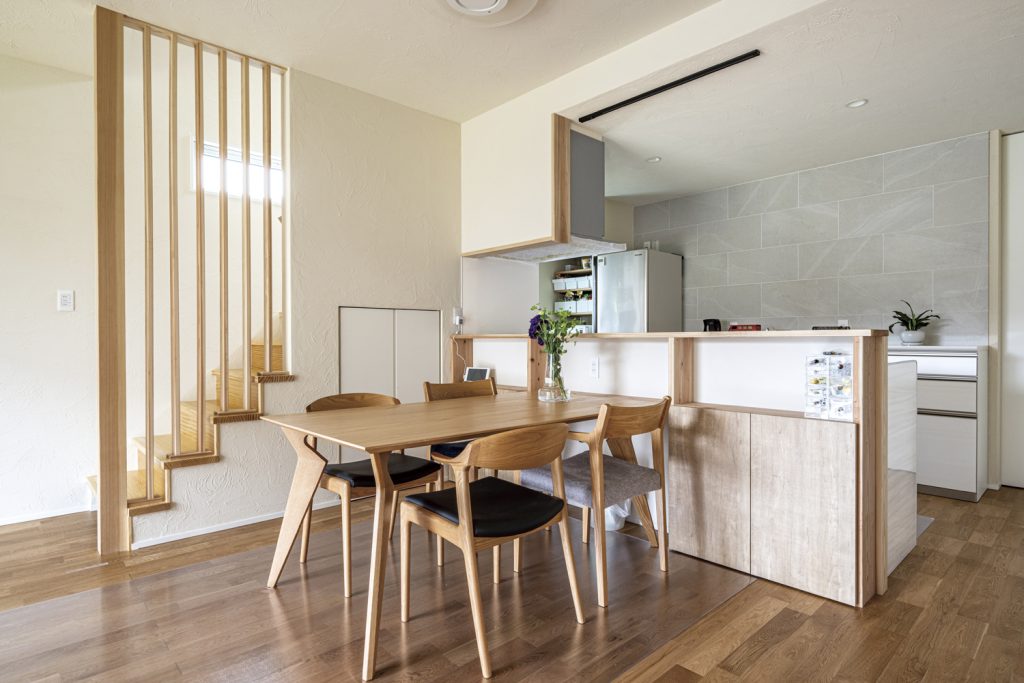 キッチンやダイニングの部分だけ無垢板にするのも。